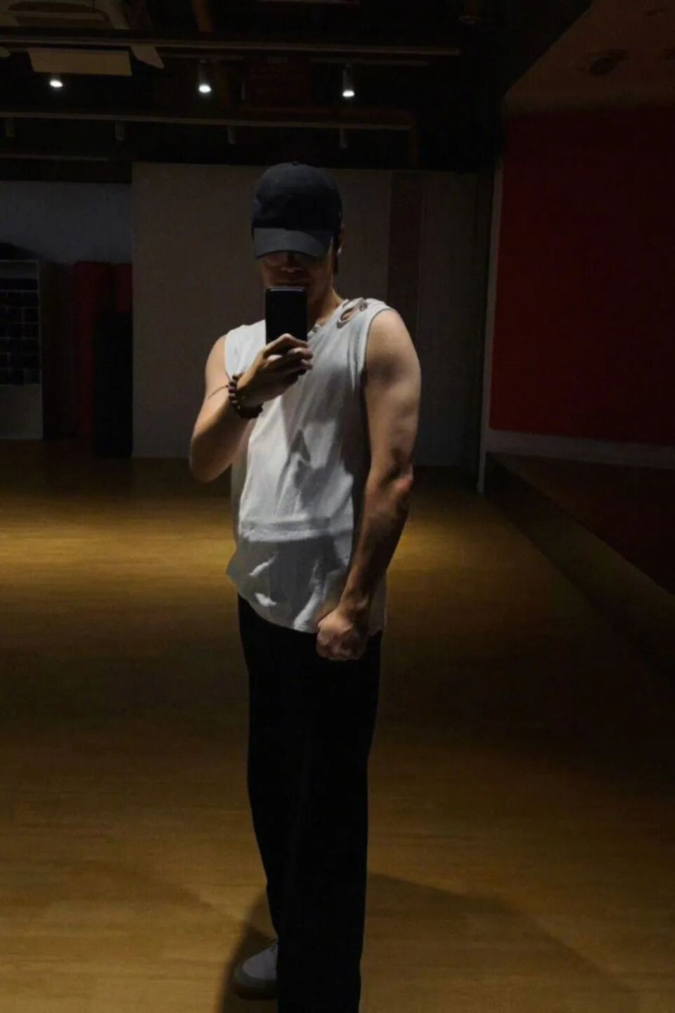 照片中,他身着白色上衣,露出手臂的肌肉线条。