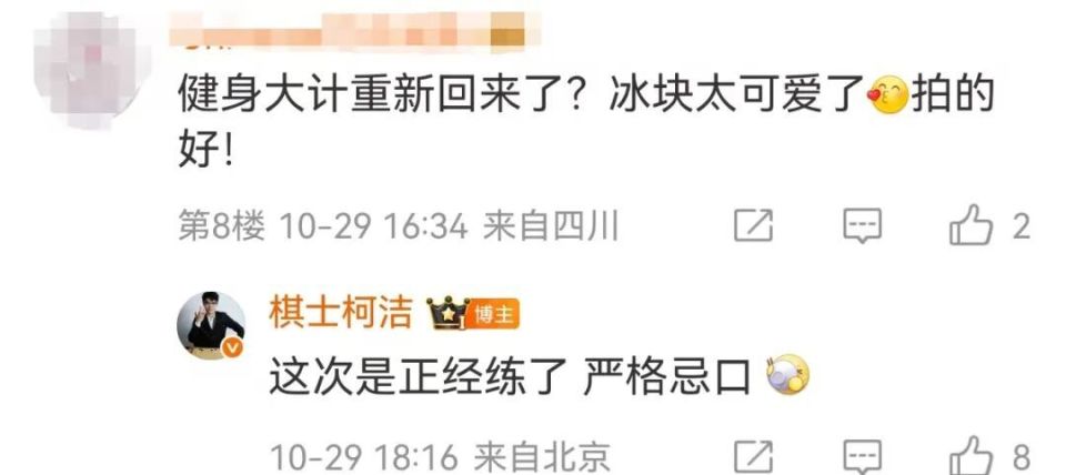 柯洁回复:“还没,记录一下成长。”他还表示,这次是正经练了,严格忌口。